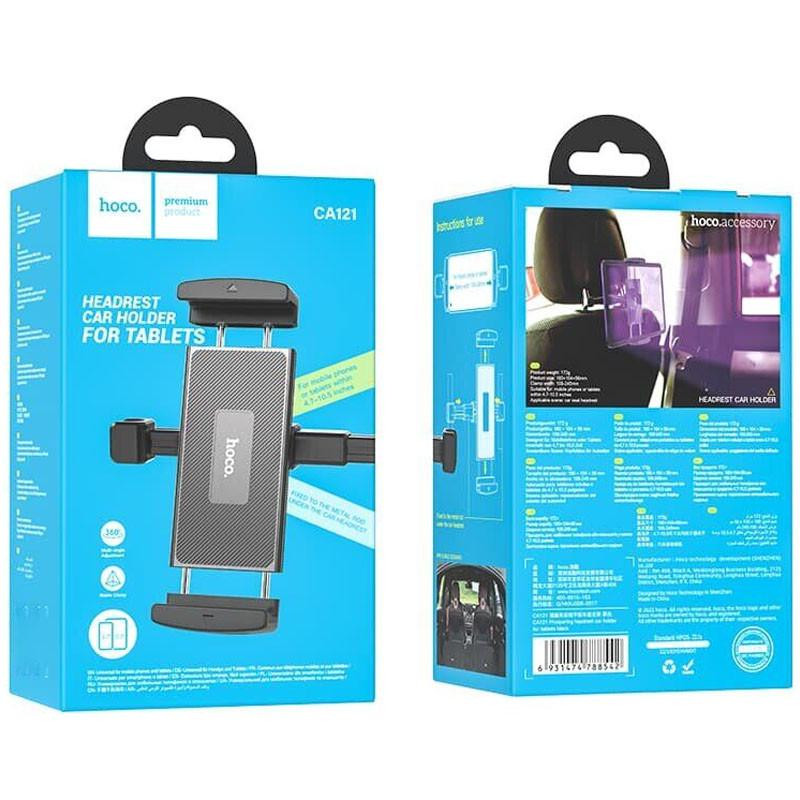 Hoco CA121 Prospering — тримач для смартфонів і планшетів на підголовник заднього сидіння автомобіля. Кріпиться на стійки підголовника за лічені секунди без інструментів і підходить для більшості автомобілів зі стандартними підголовниками. Розсувний механізм з силіконовими накладками надійно утримує пристрої від 4,7 до 12,9 дюйма — від смартфона до iPad або Android-планшета. Силікон захищає корпус і задню панель пристрою від подряпин під час їзди. Доступ до роз'єму зарядки та кнопок залишається вільним. Призначений для пасажирів задніх сидінь — зручний для перегляду відео, онлайн-ігор або читання у тривалих поїздках. Сумісний зі смартфонами та планшетами на iOS і Android.Характеристики