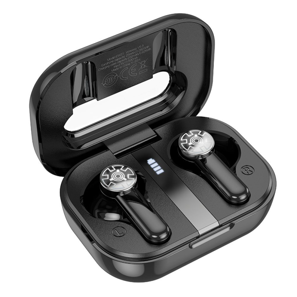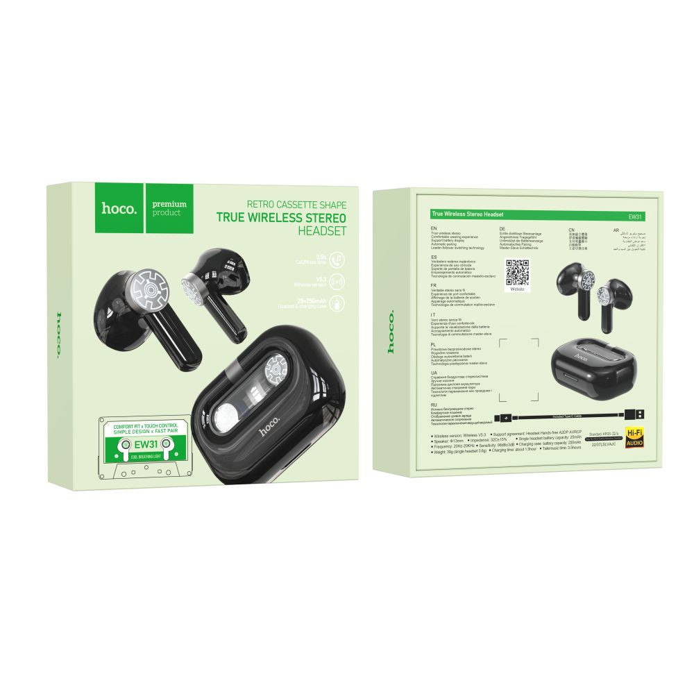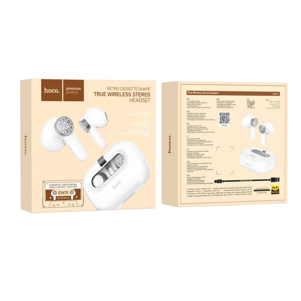 Блютуз стерео гарнітура Hoco EW31 допоможе не тільки насолодитися насиченим звучанням улюблених композицій в якості Hi-Fi, але і виділиться, підкресливши свій унікальний образ і вишуканий смак. Модель привертає увагу зарядним кейсом, який має батарею ємністю 250mAh і виконаний у вигляді аудіокасети із заокругленими ребрами, надійною кришкою з прозорою панеллю, через яку видно LED дисплей, що відображає рівень заряду, і шестерні, якими декоровані навушники. Корпуси вушних елементів мають приємну на дотик поверхню та зручну форму, що забезпечує комфортну посадку, виготовлені із міцного пластику. За стабільний бездротовий зв'язок гарнітури з джерелом звуку відповідає сучасний модуль Bluetooth V5.3, низьке енергоспоживання якого дозволяє безперервно працювати 3.5 години від акумуляторів ємністю 25mAh. Модель підтримує виклик голосового помічника та перемикання між ведучим та веденим навушником, кожен з яких забезпечений сенсорним керуванням та чутливим мікрофоном.Характеристики